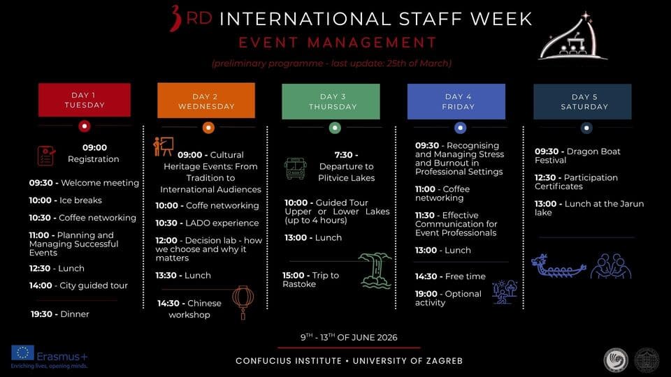 The third International Staff Week, organized by the Confucius Institute of the University of Zagreb, will be held between 9th and the 13th of June 2026. It will place Event Management at the center of its program, exploring how events can serve as powerful platforms for cultural dialogue, institutional visibility, and international cooperation.